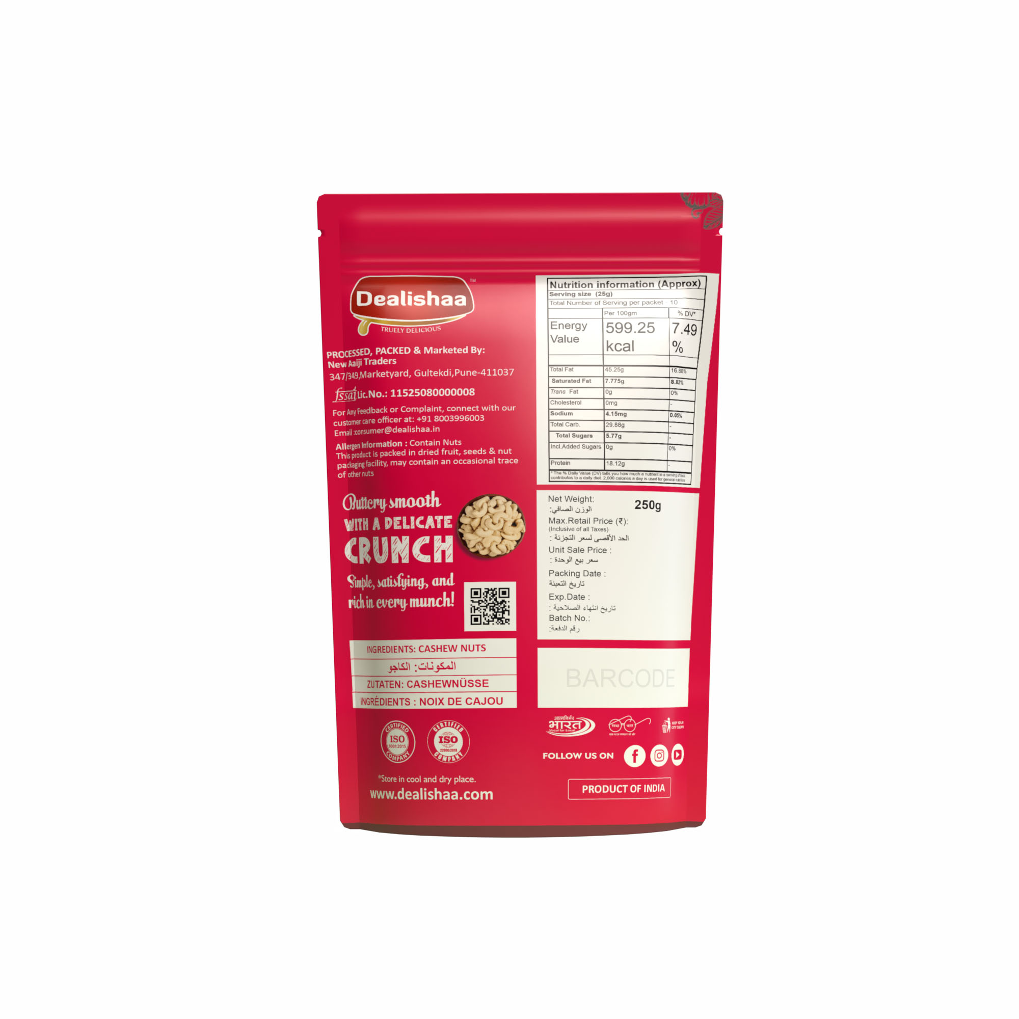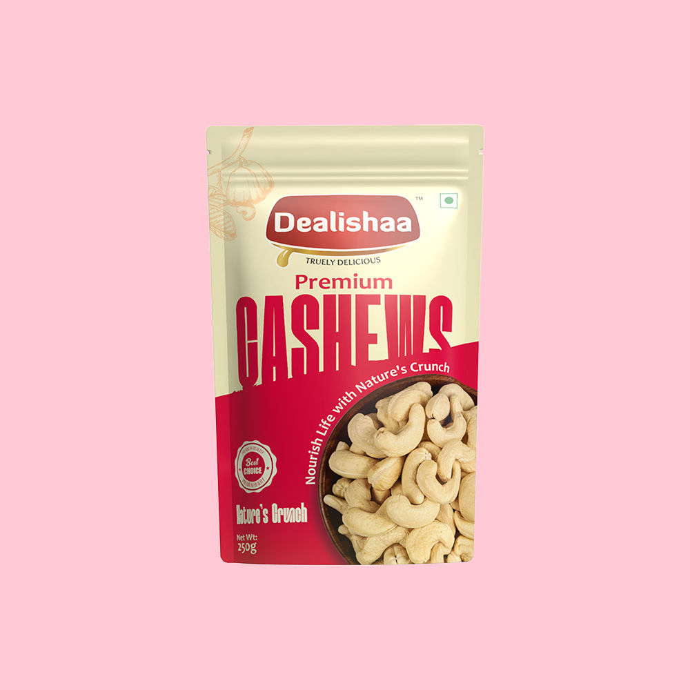 Our premium cashew nuts are processed with care and meet export quality standards, making them one of the best choices for cashew nuts in India. Whether you’re snacking or using them in recipes, Dealishaa cashews deliver quality you can rely on.
