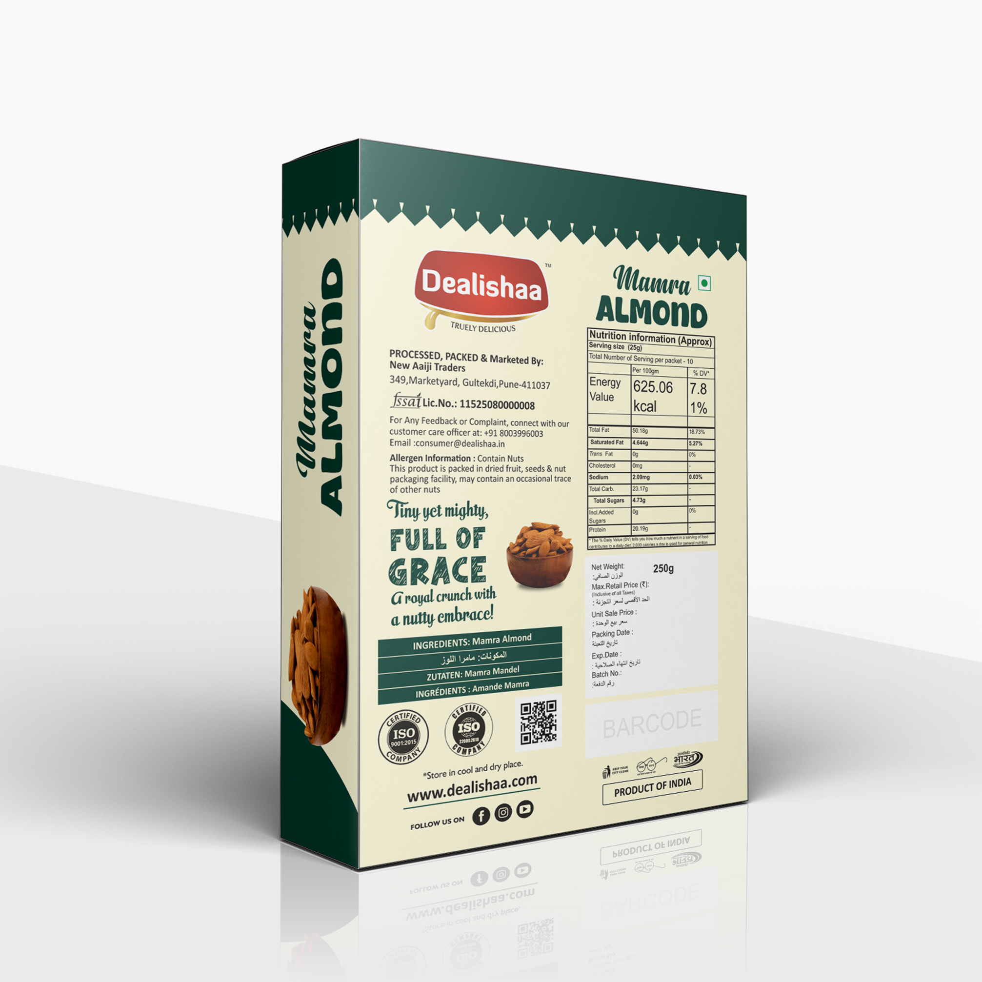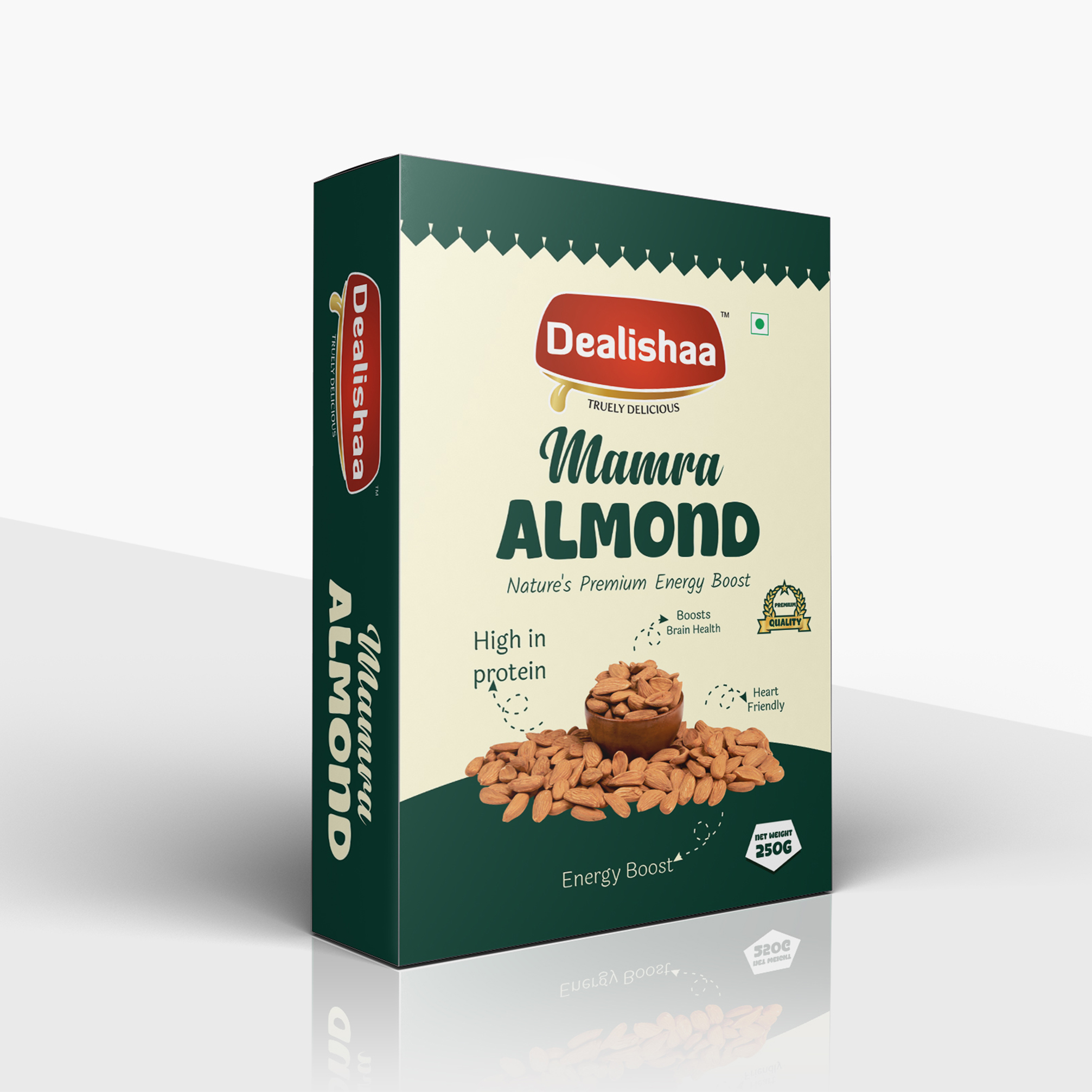 Dealishaa’s 250g Mamra Almond Box features naturally grown, oil-rich almonds known for their superior taste and texture. Packed with nutrition and a distinct crunch, these are perfect for snacking, gifting, or adding to your daily diet.