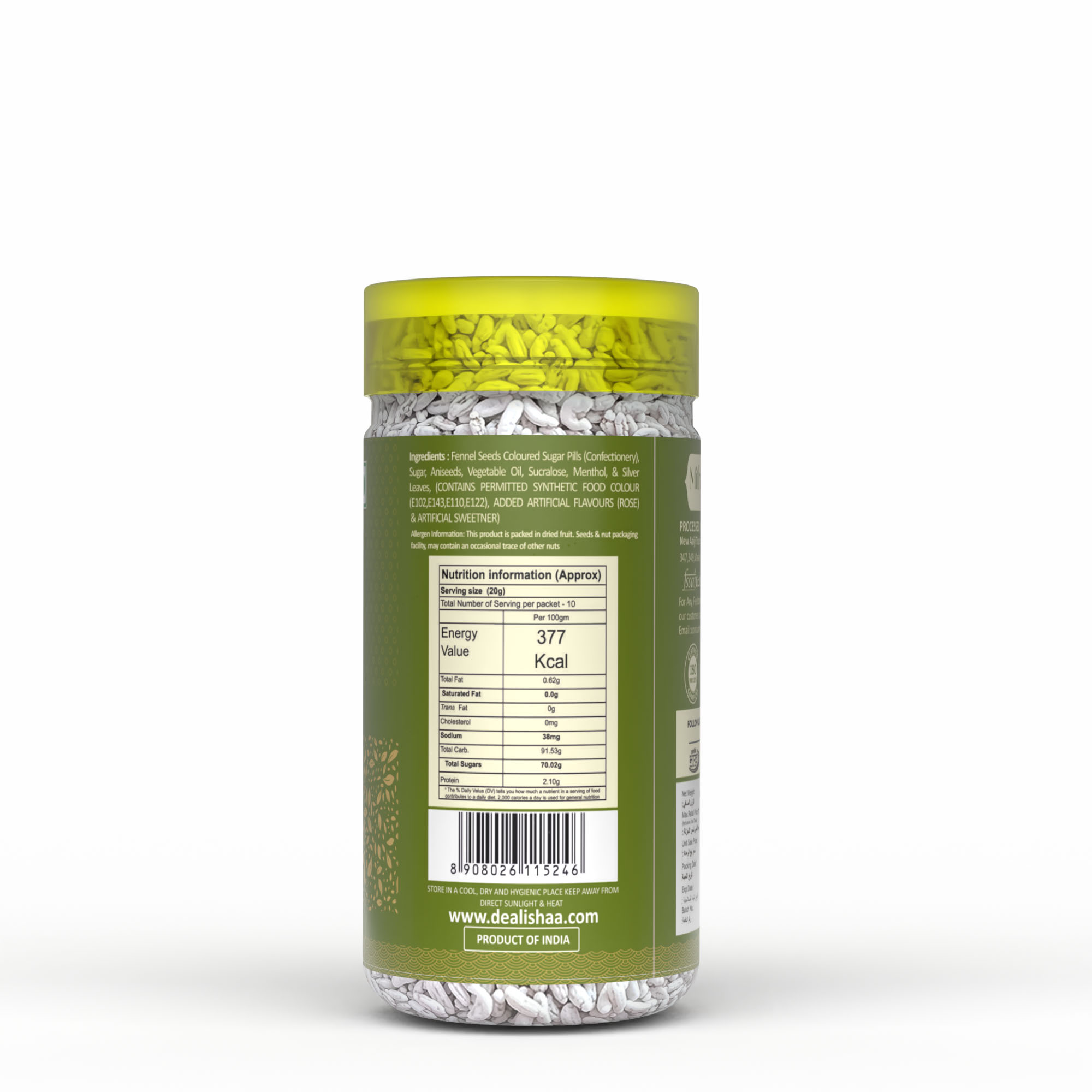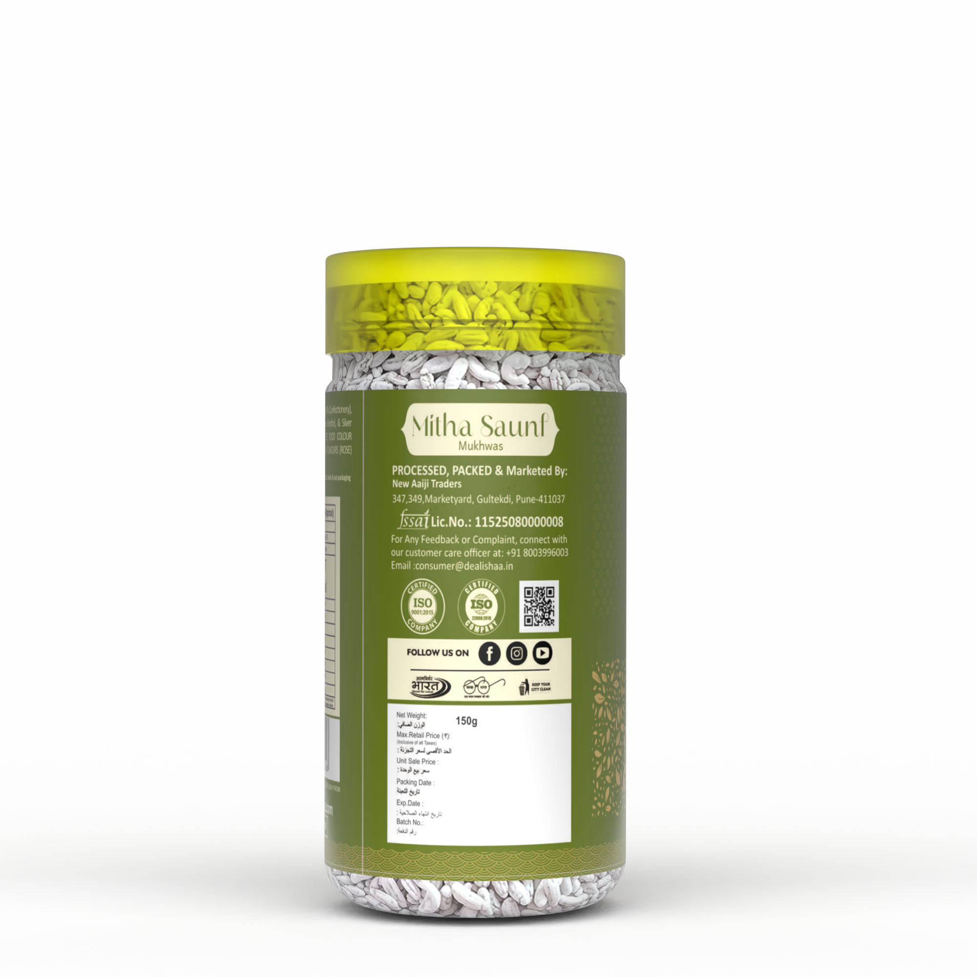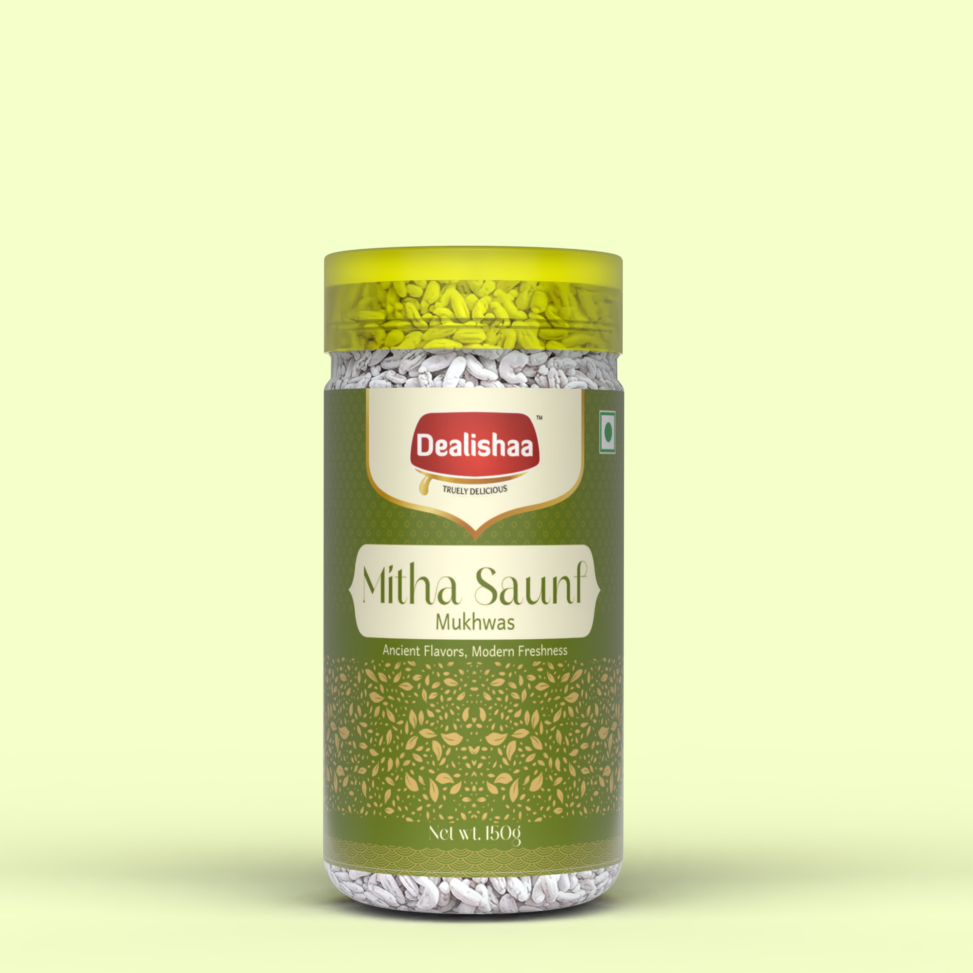 Dealishaa Mukhwas Mitha Saunf is a delicious blend of sugar-coated fennel seeds that freshen your breath and leave a pleasant aroma. Lightly sweet and crunchy, it’s a popular after-meal treat that also aids digestion. Packed in a 150g pouch to retain freshness and flavor in every bite.