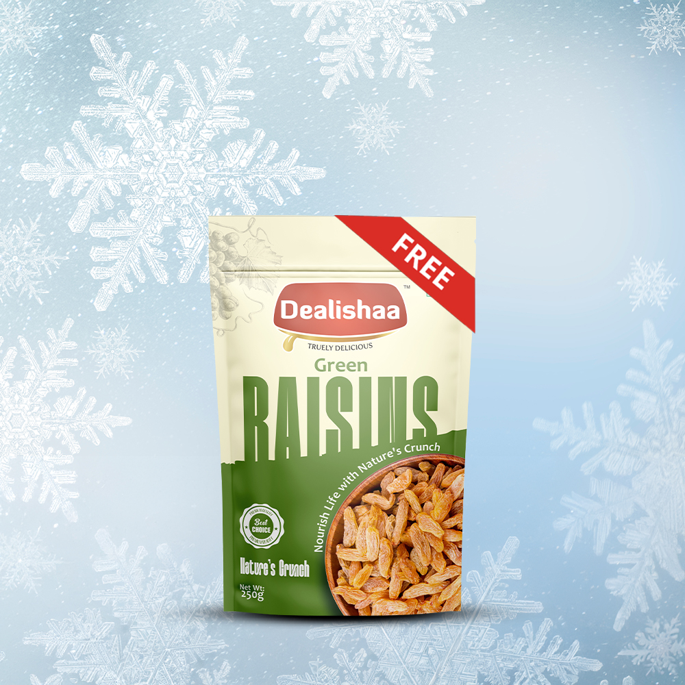 Buy 2 Premium Almond 250g + 1 Premium Cashew 250g and get 1 Green Raisins 250g free.