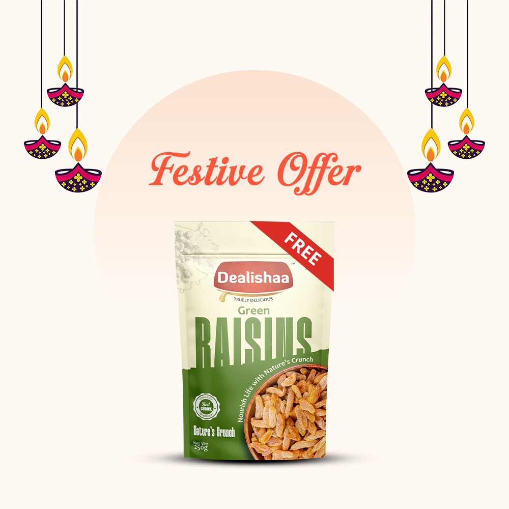 Double the joy this festive season! Buy 2 Premium Almond 250g + 1 Premium Cashew 250g and get 1 Green Raisins 250g free. A rich mix of energy, crunch, and natural sweetness – ideal for family celebrations, gifting, or everyday nutrition.